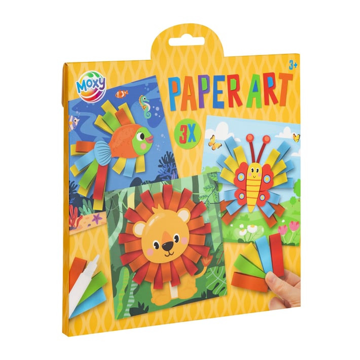 С комплекта от Moxy „Изкуство с хартия“ децата създават свои цветни 3D картини по забавен и лесен начин. Съдържа 3 картонени шаблона и готови цветни хартиени ленти, които се прегъват и залепват върху картинката. Така малките творци изграждат релефни елементи на животни и още много сладки герои.Комплектът развива фината моторика, въображението и чувството за цвят и форма, като същевременно предлага спокойна и приятна творческа активност у дома или в училище.Идеален избор за малки творци, които обичат да създават красиви и пъстри проекти!