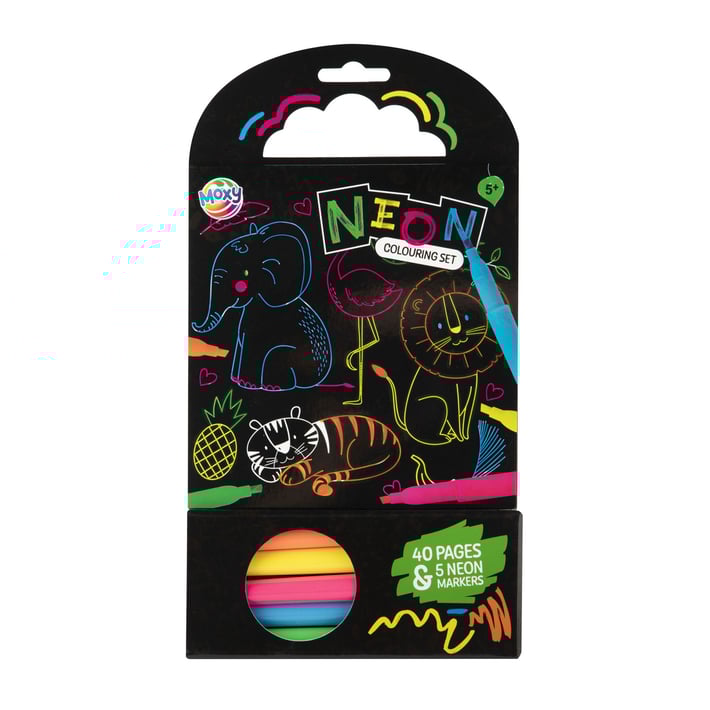 Неоновата книжка за оцветяване Moxy превръща всяка рисунка в цветно приключение. Книжката съдържа 40 страници с весели и забавни илюстрации, които оживяват благодарение на включените 5 неонови маркера. Контрастният черен фон прави цветовете още по-ярки и впечатляващи, а удобният формат я прави идеална за път, игра у дома или като творчески подарък.Подходяща за деца над 3 години – развива фината моторика, въображението и усещането за цвят.