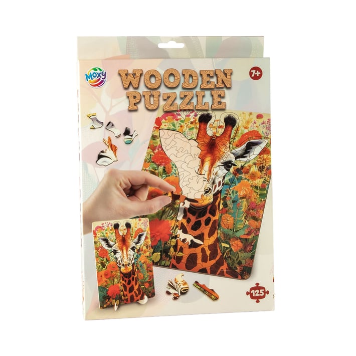 Внесете цвят и настроение у дома с този красив дървен пъзел с изображение на жираф.Пъзелът съдържа 130 прецизно изрязани части, като някои от тях са във формата на животни и декоративни елементи, което прави подреждането още по-интересно и забавно.Изработен от висококачествено дърво, пъзелът е едновременно здрав, устойчив и приятен на допир. В комплекта е включена и поставка, за да можете да изложите готовата картина като декорация в детската стая.Подходящ за игра, развитие на концентрацията и логическото мислене, както и за семейни моменти у дома.