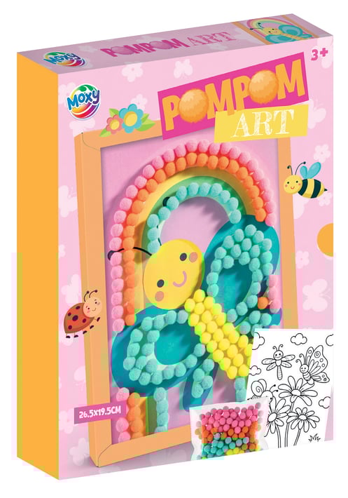 • Включва картинка в рамка, върху която детето лесно залепва меките цветни помпони и оформя красиво и забавно изображение.