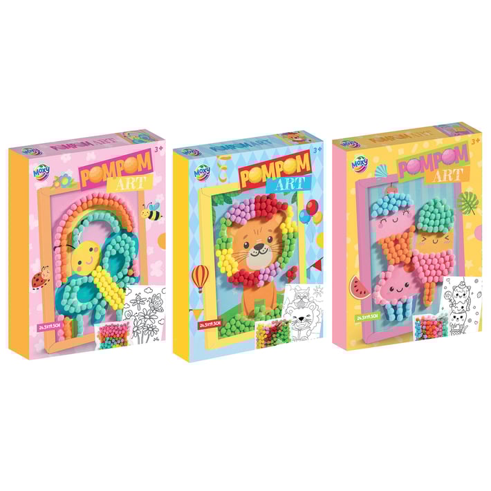 С този цветен творчески комплект децата могат да създадат своите първи 3D картини с пухкави помпони! Всеки сет включва картинка в рамка, върху която детето лесно залепва меките цветни помпони и оформя красиво и забавно изображение. Забавлението е гарантирано, а резултатът – сладка декоративна картина за стаята.Комплектът развива фината моторика, въображението и усещането за цветове и форми, като същевременно предлага спокойна и приятна занимателна игра.Комплектът включва по 8 броя от трите дизайна.