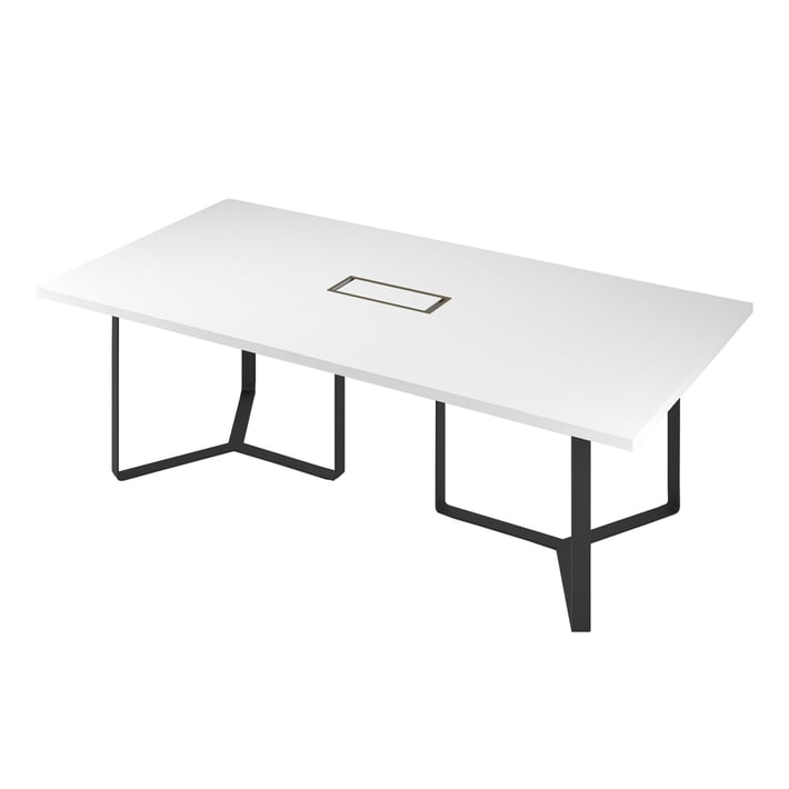 Заседателна маса Narbutas Plana, 2400 x 1200 x 750 mm, правоъгълен плот, ПДЧ 36 mm, бял меламин, черен метал, бронзов метал на кабелната кутия