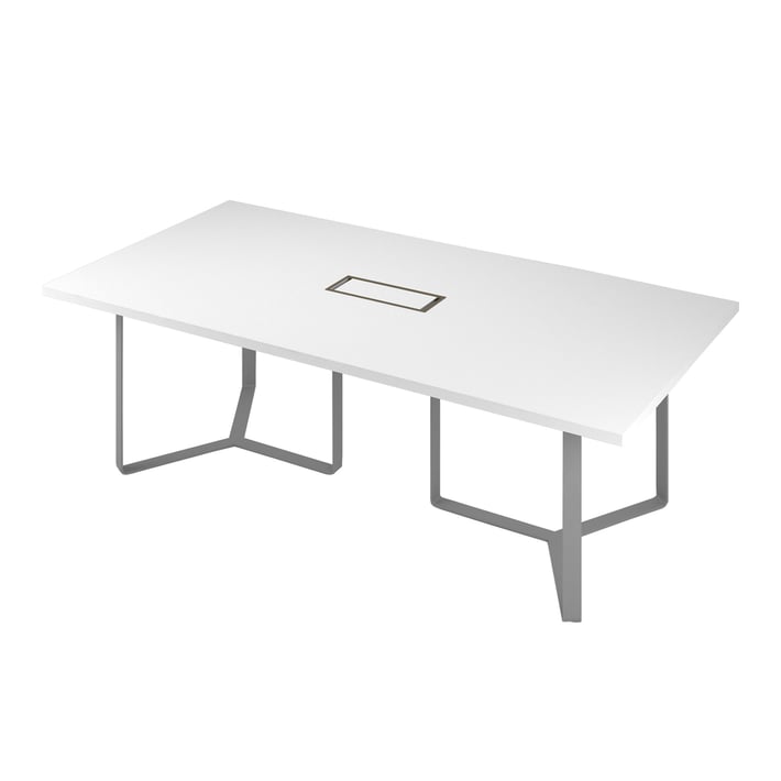 Заседателна маса Narbutas Plana, 2400 x 1200 x 750 mm, правоъгълен плот, ПДЧ 36 mm, бял меламин, сив метал, бронзов метал на кабелната кутия