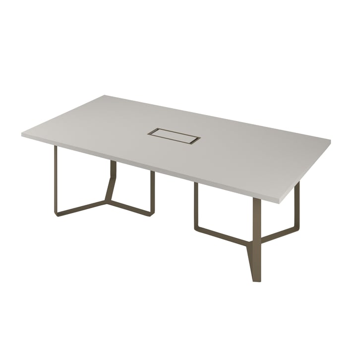 Заседателна маса Narbutas Plana, 2400 x 1200 x 750 mm, правоъгълен плот, ПДЧ 36 mm, перленосив меламин, бронзов метал, кабелната кутия бронз