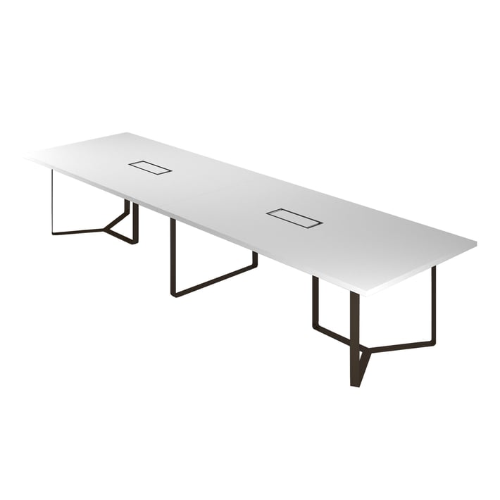 Заседателна маса Narbutas Plana, 4200 x 1200 x 750 mm, правоъгълен плот, ПДЧ 36 mm, бял меламин, бронзов метал, черен метал на кабелната кутия