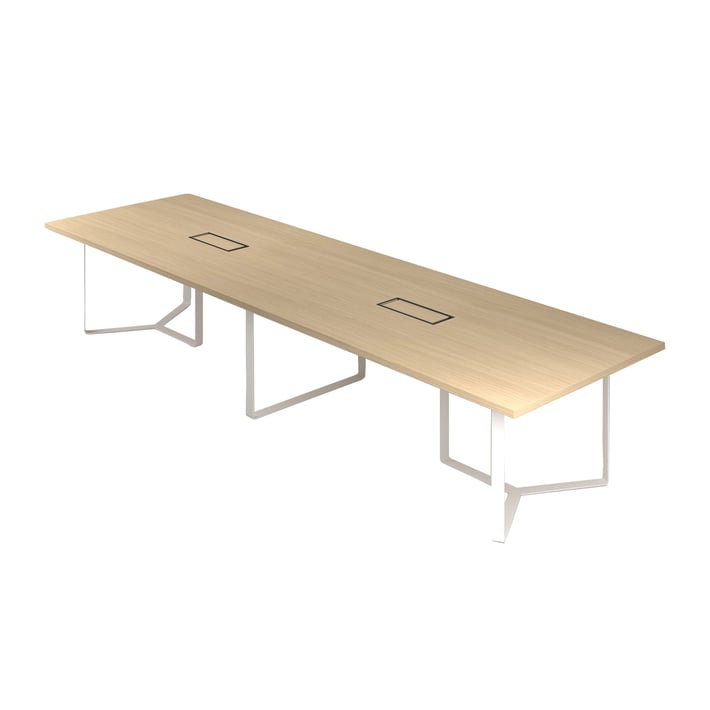 Заседателна маса Narbutas Plana, 4200 x 1200 x 750 mm, правоъгълен плот, ПДЧ 36 mm, избелен дъб, бял метал, черен метал на кабелната кутия