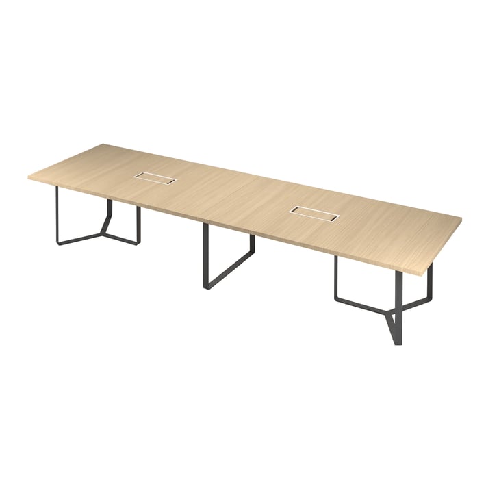 Заседателна маса Narbutas Plana, 4200 x 1200 x 750 mm, правоъгълен плот, ПДЧ 36 mm, избелен дъб, тъмносив метал, бял метал на кабелната кутия