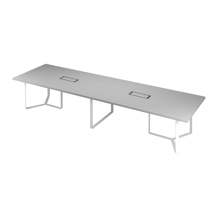 Заседателна маса Narbutas Plana, 4200 x 1200 x 750 mm, правоъгълен плот, ПДЧ 36 mm, тъмносив меламин, бял метал, тъмносив метал на кабелната кутия