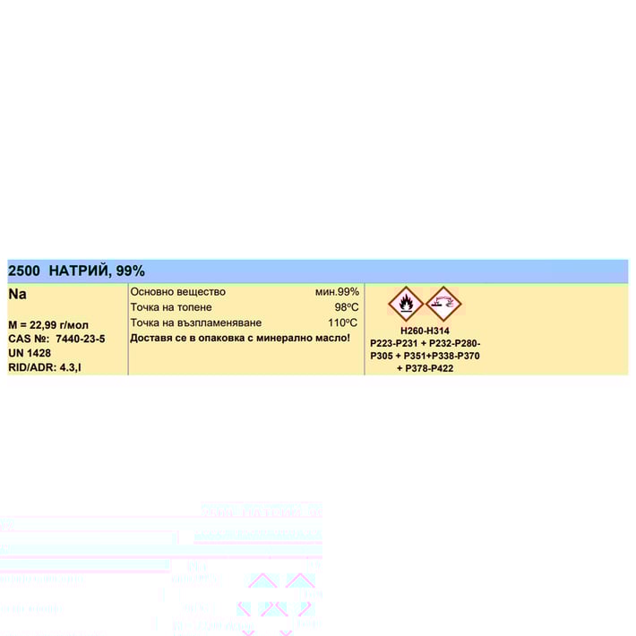 Предупреждения за опасност: H260-H314, P223-P231 + P232-P280- P305 + P351+P338-P370 + P378-P422.
