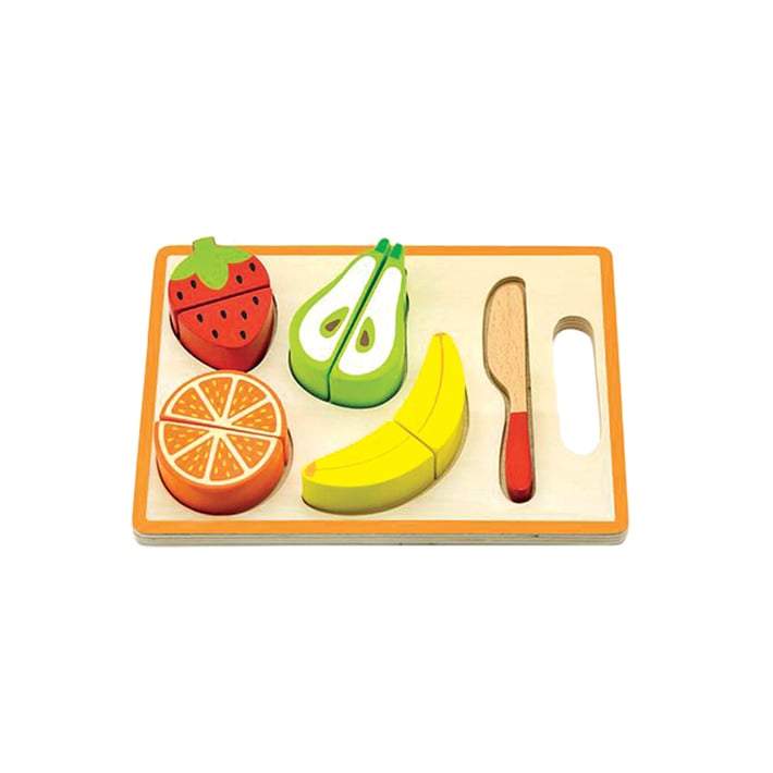 Комплект с дъска за рязане, нож и 8 половинки плодове. Играта осигурява забавление, което включва рязане, сглобяване и ролеви игри.