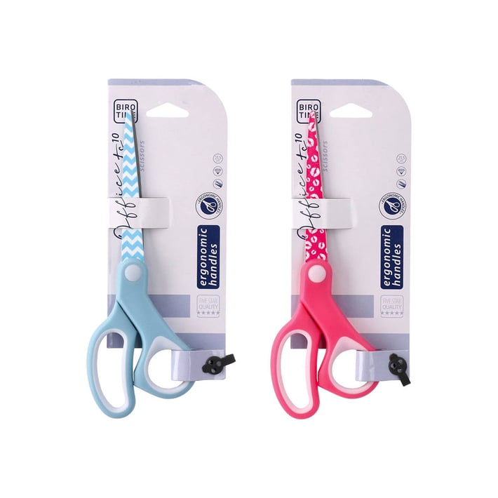Ножица за ежедневна употреба с ергономични дръжки, осигуряващи удобен захват и прецизно рязане. Подходяща е за работа у дома, в училище или в офиса. Остриетата са изработени от висококачествена неръждаема стомана, която гарантира дълготрайна острота и надеждна работа. Модерният печат върху острието придава стилен и отличителен вид на ножицата.