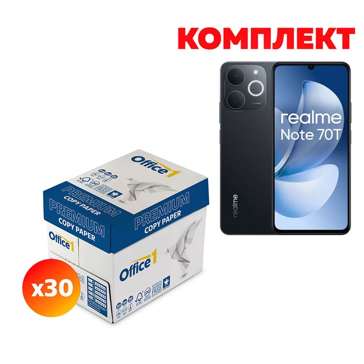 Office 1 Копирна хартия Premium, A4, 80 g/m2, 30 кашона, в комплект с Realme Смартфон Note 70T, Dual SIM, 128 GB, 4 GB RAM, 6.74'', черен