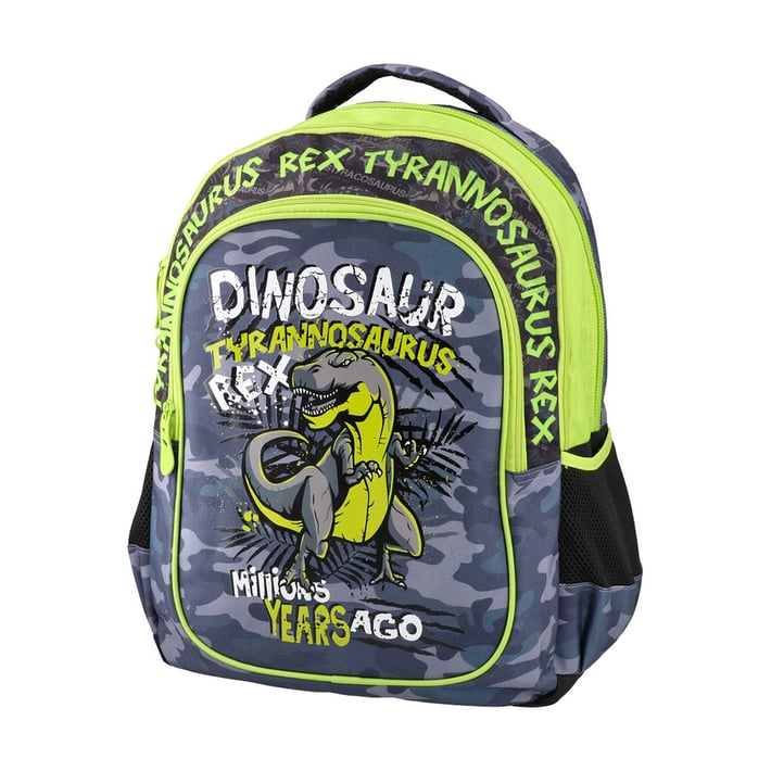 Практична и удобна детска раница „Динозавър“, създадена за активно ежедневие и комфорт при носене. Самостоятелно стоящата конструкция и тройно подсилените шевове осигуряват стабилност и дълготрайна издръжливост, а водоустойчивата тъкан предпазва съдържанието при различни условия.Раницата е изработена от висококачествен полиестер 300D, лека и устойчива на износване. Регулируемите презрамки с форма на банан и катарамата за фиксиране гарантират стабилно прилягане към тялото, а анатомично оформеният мрежест гръб осигурява добра вентилация и комфорт дори при по-дълго носене. Меката дръжка с подплата улеснява пренасянето, а страничните джобове предлагат място за бутилка или дребни аксесоари.Размери:43 x 33 x 20 cm.
