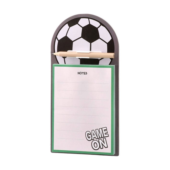 • Комплектът включва самозалепващи листчета в свеж дизайн с футболни елементи и редове за по-лесно писане, поставени върху стабилна картонена основа, както и графитен молив.
