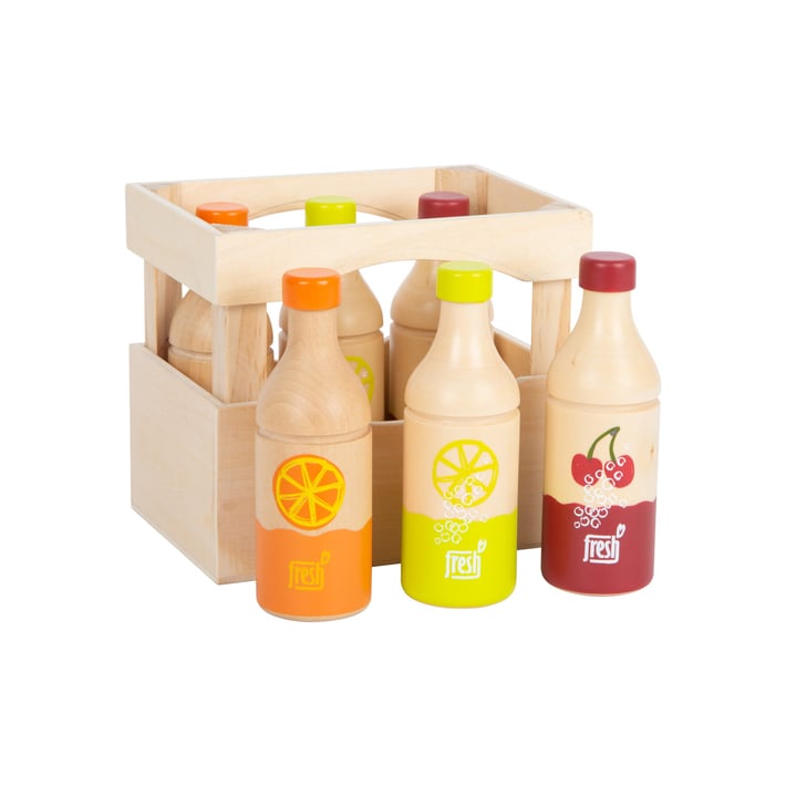 Тази дървена щайга съдържа шест бутилки, изработени от масивно дърво. Тя е идеалното допълнение към детската кухня или магазин за игра. Благодарение на семплите илюстрации, бутилките са лесни за разбиране дори от по-малките деца.