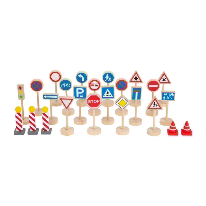 Тези международни пътни знаци, изработени от дърво, ще въведат ред в пътното и железопътното движение в детската стая. Реалистично проектираните улични знаци със здрави основи не само регулират трафика в света на игрите, но също така предават знания за важни правила за безопасността на движението.