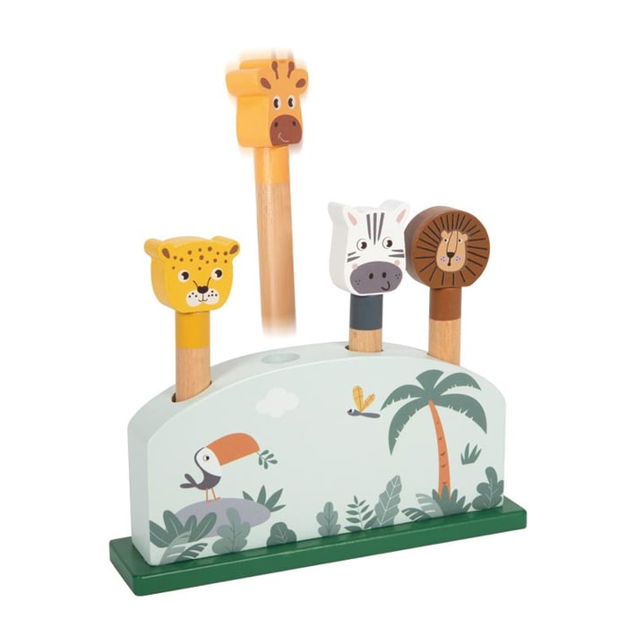 Натисни главите на животните и ги виж как подскачат обратно—очарователна изненада, която възнаграждава любопитството. Тази здрава дървена дъска тренира скоростта на реакциите и прецизните движения на ръцете.