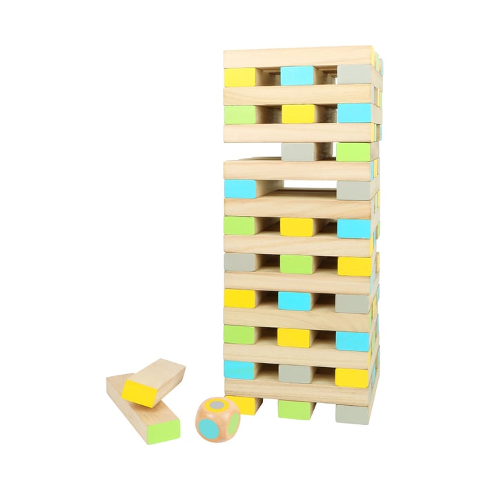Популярна, класическа игра в XXL формат! Настолната дженга се състои от 61 части, изработена от FSC® 100% сертифицирано дърво и е идеална за игра на открито. Играта тренира сръчността и логиката на участниците, докато те изтеглят отделни блокове от кулата. Друга особеност е включената цветна матрица, която диктува кое кубче със съответния цвят трябва да бъде изтеглено.Частите са оцветени в светлозелено, жълто, синьо и сиво, така че да са видими и в игра на открито, на трева. Тази игра е хит както за младите, така и за по-възрастните играчи и едновременно тренира търпението, двигателни умения и логиката.