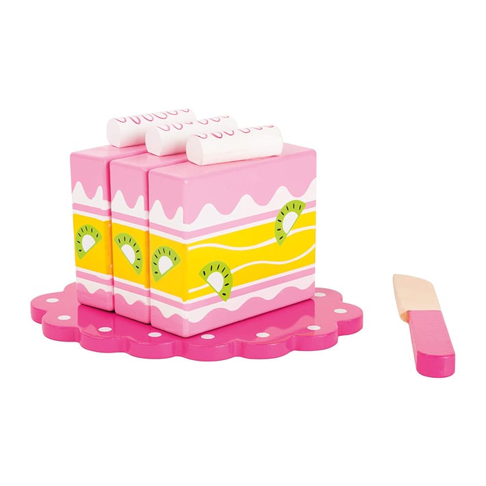 Вкусното парченце торта върви перфектно с кафето на всяко дете. Дървената розова торта се състои от три отделни парчета, свързани с велкро закопчалки, така че изрязването става изключително лесно. Никой не може да устои на парче от тази вкусна торта!