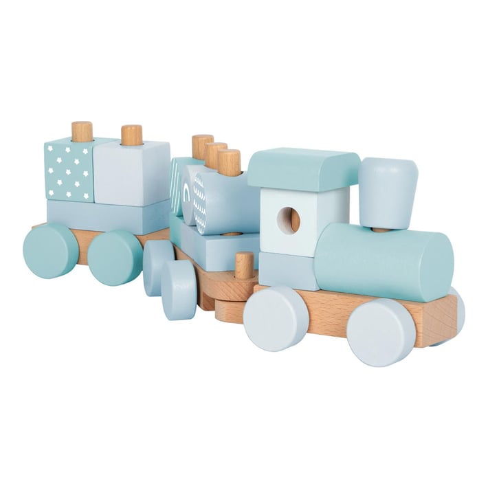 Модерен 2-в-1 дървен влак и игра за вграждане в успокояващи сини тонове. Включва 14 елемента за нанизване, локомотив и два вагона. Блокчетата могат да се използват и отделно за креативна игра.
