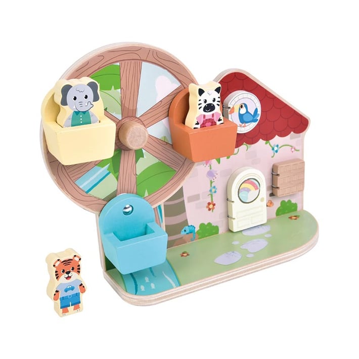 Завърти манивелата и изпрати трима животински приятели на разходка, докато откриваш съвпадащи мотиви зад отварящите се капачета. Активна игра, която развива координацията и насърчава въображението.