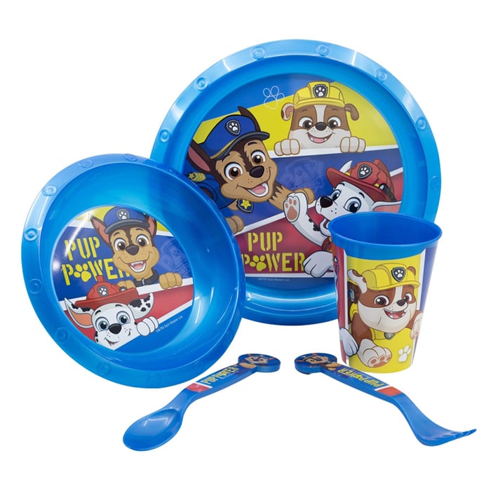 Детски сервиз за хранене за обяд или вечеря „Пес Патрул“, състоящ се от чаша, купа, чиния и прибори.