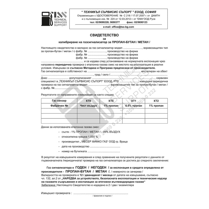 Свидетелство за калибриране на газ сигнализатор, А4, химизиран, двупластов, цветен