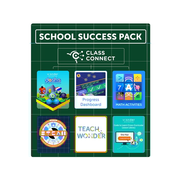 School Success включва лиценз за всички учители и ученици в училище с програмата Class Connect, която позволява следене на напредъка на всеки ученик, както и достъп до 3-D средата за програмиране на виртуален Dash - Dash's Neighborhood.